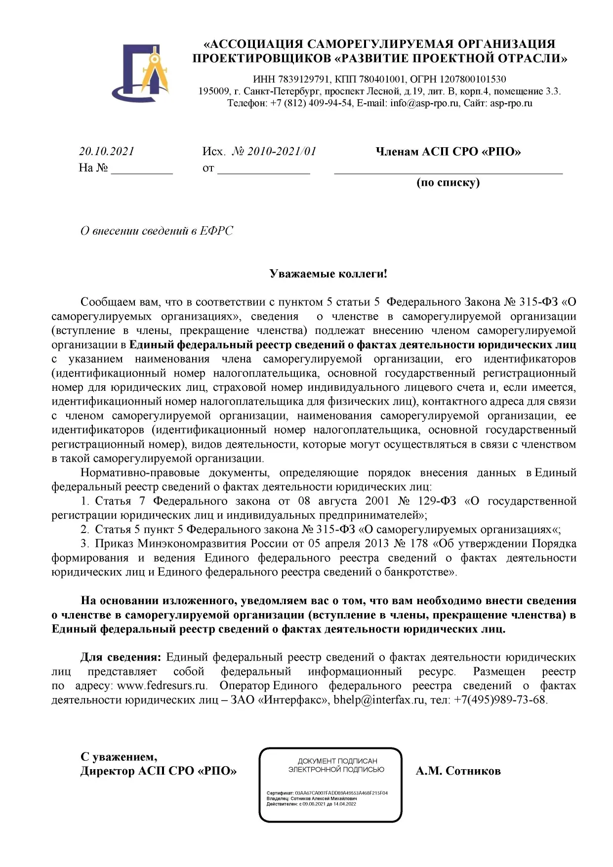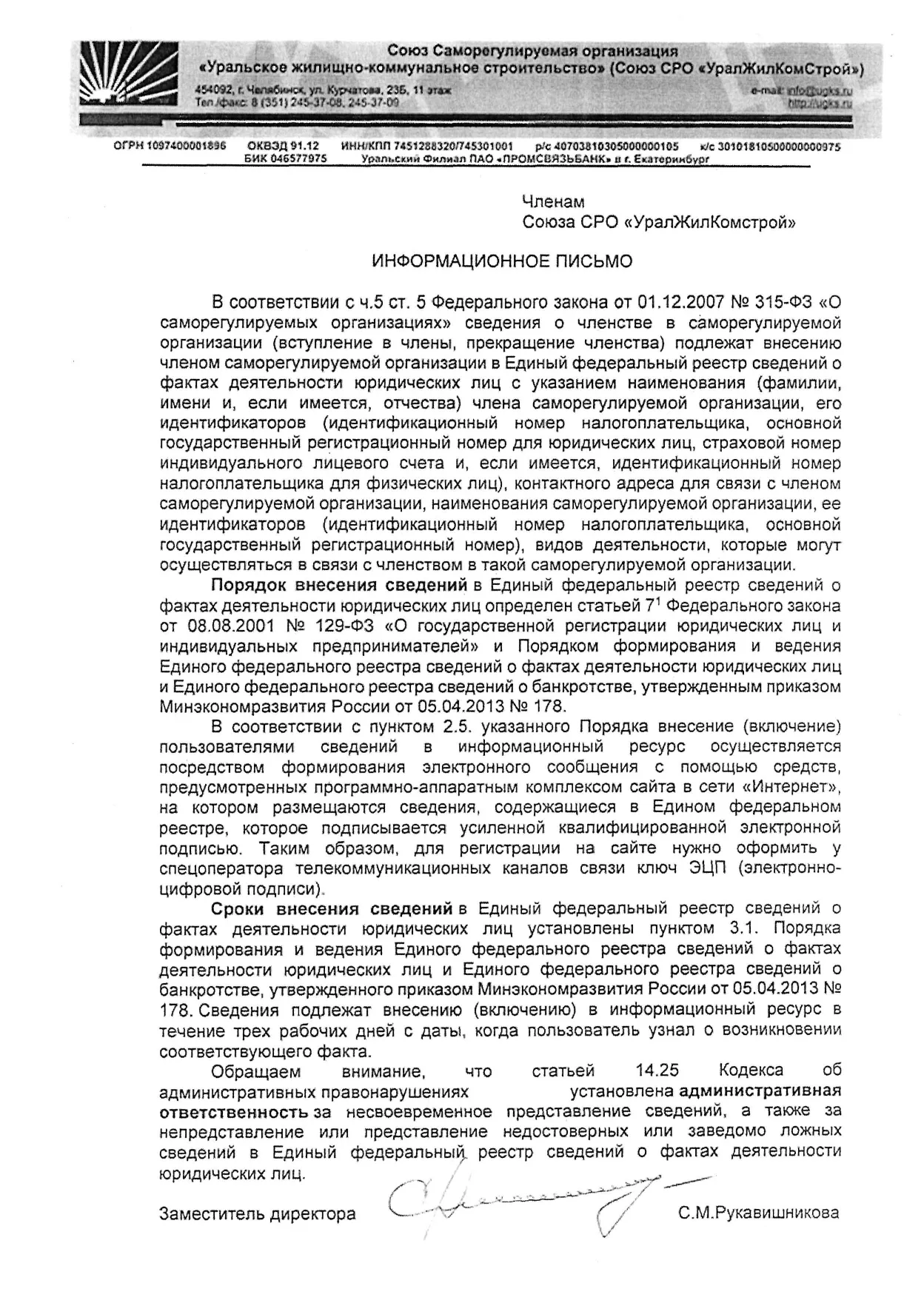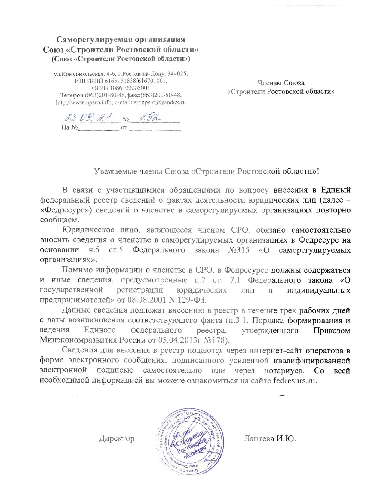 Сами саморегулируемые организации уже в курсе ситуации с активным контролем Федресурса и штрафами в адрес членов СРО. В связи с этим саморегулируемые организации активно призывают соблюдать обязанность, установленную ч. 5 ст. 5 ФЗ № 315 «О СРО», рассылая членам СРО информирующие письма:
