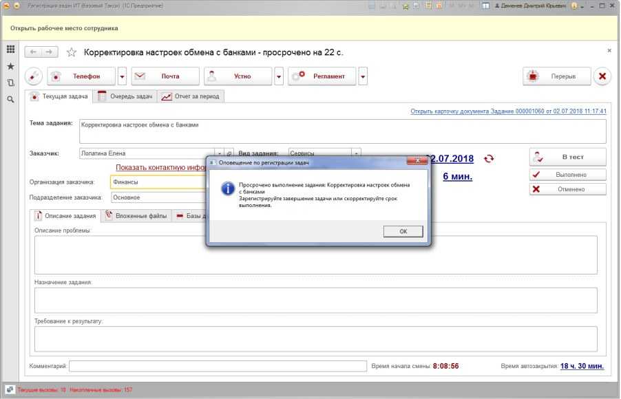 В форме ведется обратный отсчет времени для текущей рабочей задачи с отображением автообновляемого оставшегося времени.