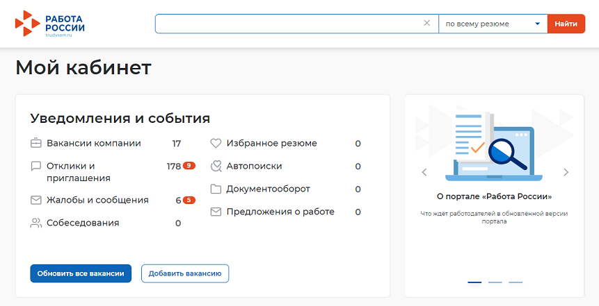 - В личном кабинете: смотреть, кто заинтересовался вакансией, знакомиться с резюме кандидата, вести переписку, отправить приглашение на собеседование.