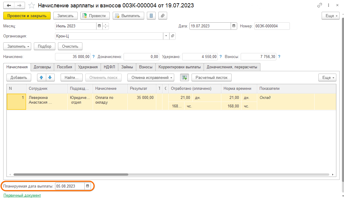 Порядок исправления: обязательно распроводим документ (если он уже проведен, но дата пуста), затем проставляем дату предполагаемой выплаты, после чего выполняем проведение. Не проставляйте дату сразу в уже проведенном документе с последующим перепроведением! Даты выплаты, указанные индивидуально — никак от этого не меняются (их вы можете проверить уже на вкладке НДФЛ в документе).