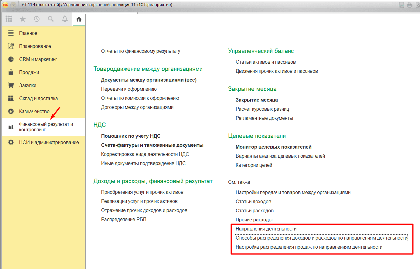 Далее нас будет интересовать группа команд в разделе Финансовый результат и контроллинг: