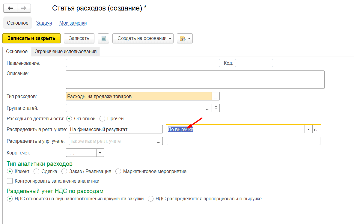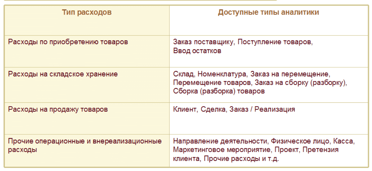 Выбранный тип расходов определяет выбор возможных вариантов распределения суммы расходов по данной статье и доступные виды аналитики.