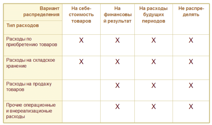 - на себестоимость товаров — расходы будут увеличивать себестоимость ТМЦ (согласно выбранной аналитики расходов).