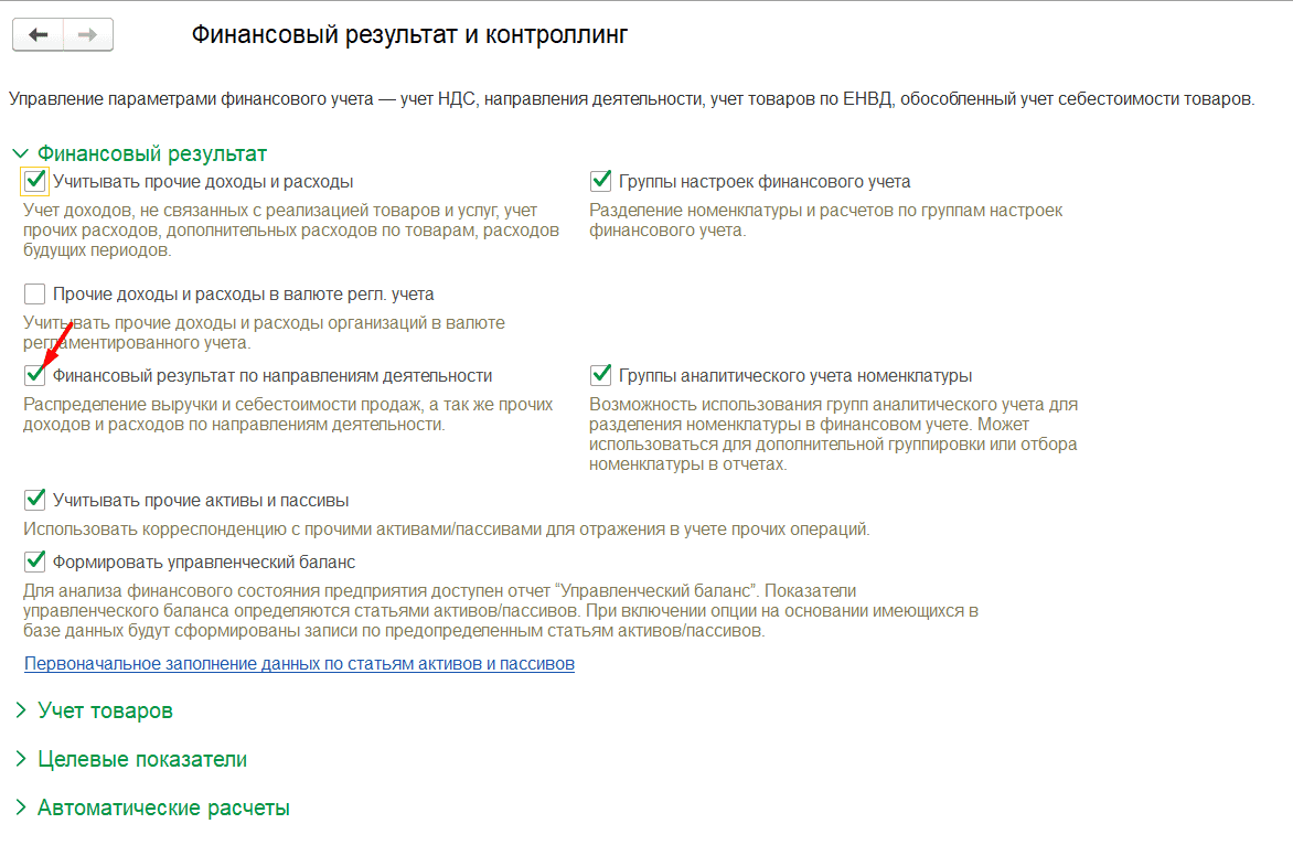 В разделе Финансовый результат и контроллинг включаем галку Финансовый результат по направлениям деятельности.