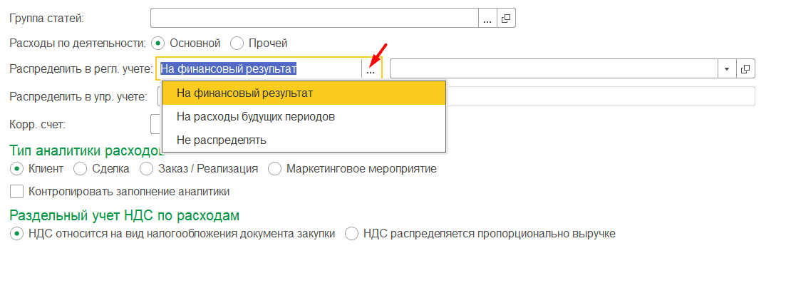 Если у вас включен раздельный учет НДС, необходимо выбрать вариант распределения НДС по расходам в рамках статьи.