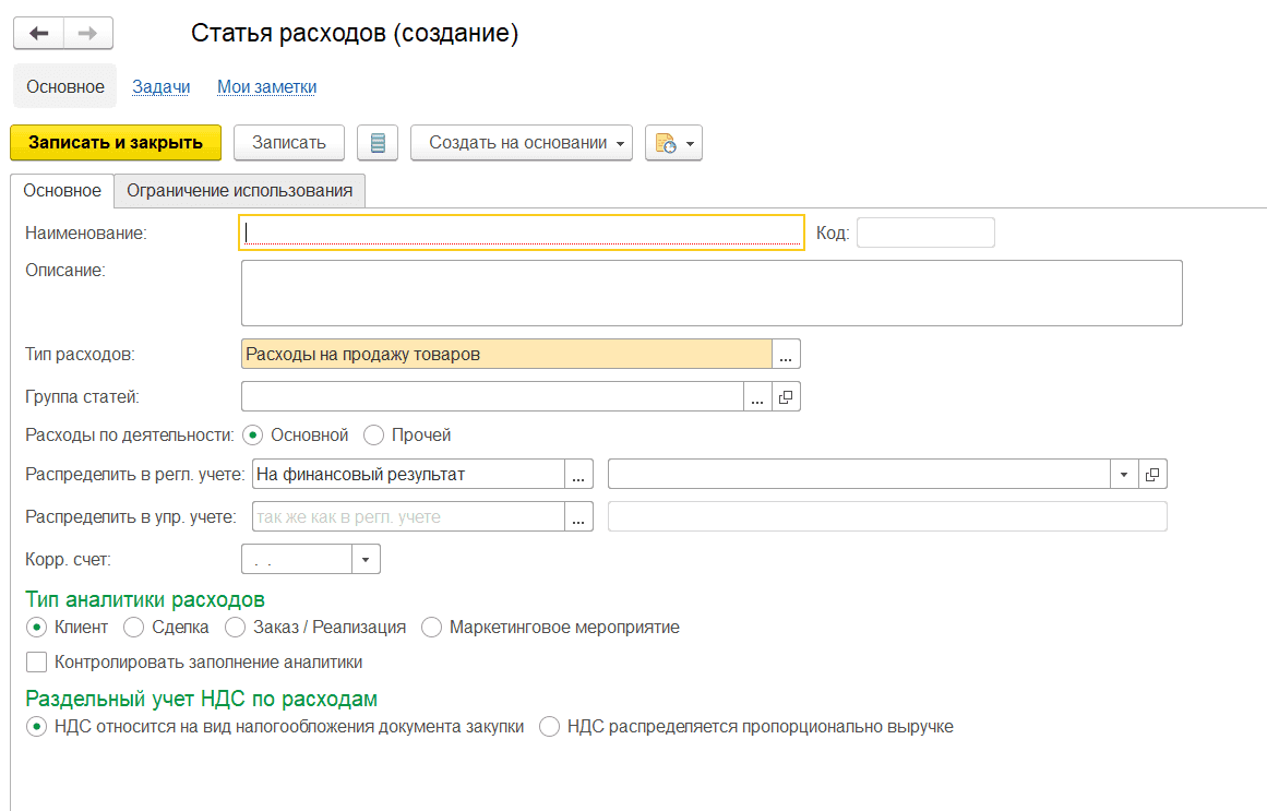 Карточка статьи расходов имеет такой вид: