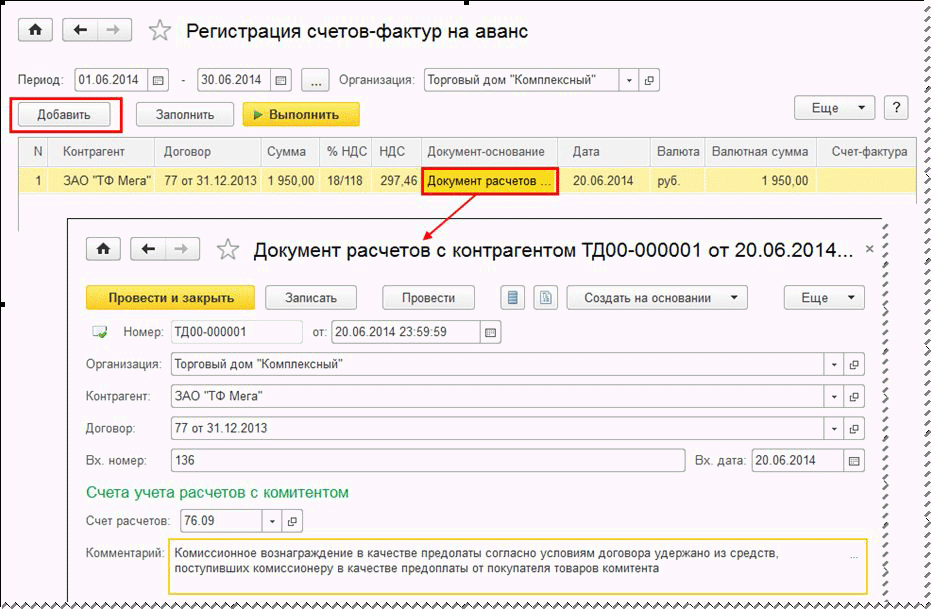 Регистрация авансового счета-фактуры на комиссионное вознаграждение