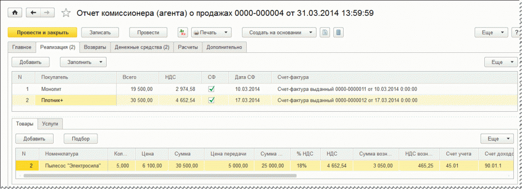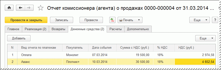 важно в случае получения предоплаты от покупателя, так как при утверждении отчета о полученных денежных средствах к комитенту переходит обязанность начисления НДС с аванса. В нашем примере информация, отраженная на закладке Денежные средства