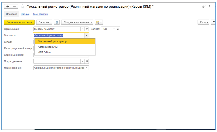 Рис. 8. Пример создания кассы ККМ с выбором типа кассы