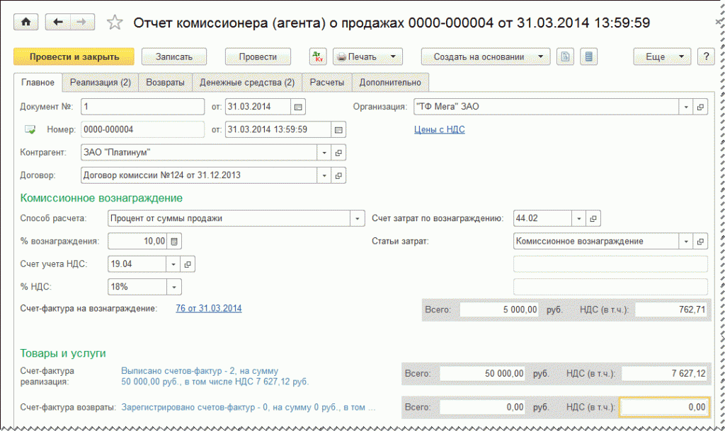 , как в отношении реализации комитента, так и в отношении комиссионного вознаграждения, рассчитываются автоматически согласно данным, заполненным на закладке формы документа Реализация