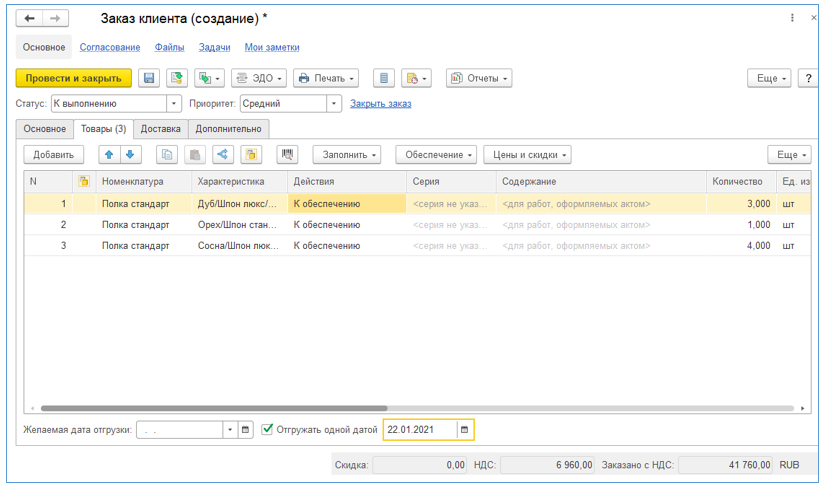 После того, как достигается договоренность с клиентом о продаже определенного перечня номенклатуры, а также о порядке и сроках оплаты за товар, можно ввести документ «Заказ клиента». Это можно сделать на основании коммерческого предложения.