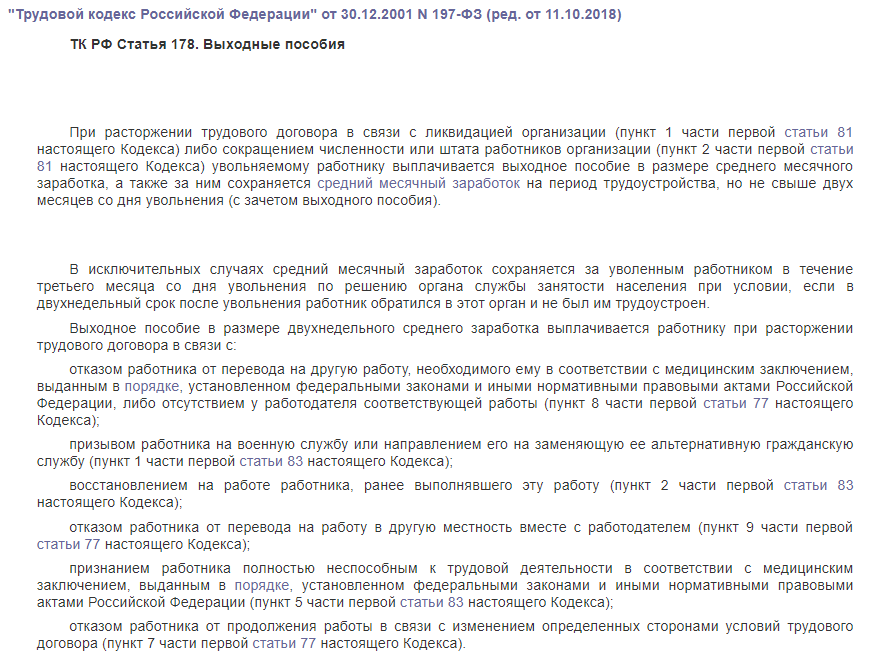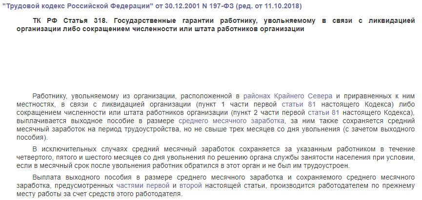 Если сотрудничество прекращено из-за сокращения численности штата или ликвидации предприятия, то уволенные граждане продолжают получать заработную плату. Условие не распространяется на тех, кто работает по совместительству, сезонных сотрудников. Для всех регионов предусматривается размер выплаты, равный одной среднемесячной зарплате (допускается превышение, но не больше, чем втрое). Если предприятие находится на Крайнем Севере, то компенсация не должна превышать среднюю зарплату больше, чем в 6 раз.