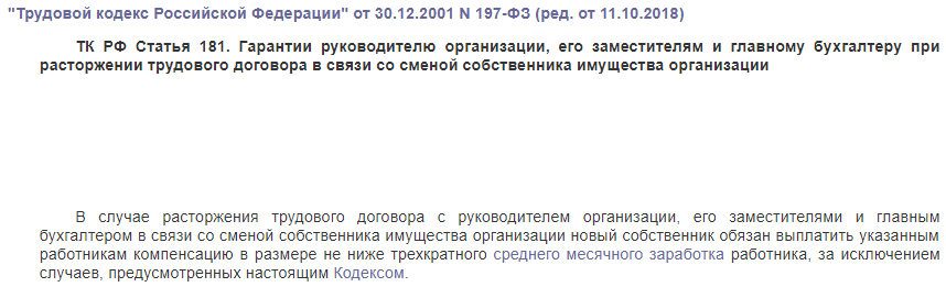 Если увольняется руководитель, его заместитель или главный бухгалтер, размер выплаты – 3-месячный заработок (или выше). Причина увольнения в данном случае – смена собственника компании.