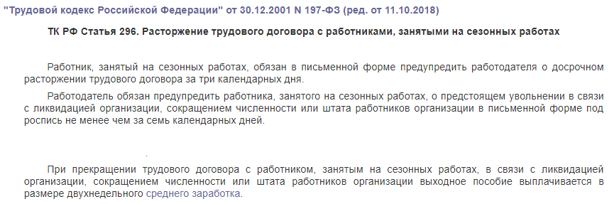 ликвидацией организации или сокращением штата (для сотрудников, занятых на сезонных работах);