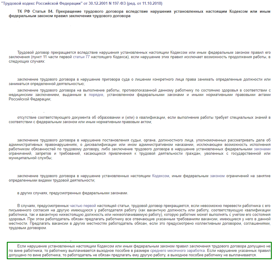 Еще одно основание – нарушение компаний правил заключения трудового договора. В этом случае размер выходного пособия – это одна месячная зарплата.
