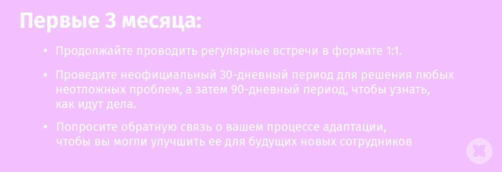 - Проведите неофициальный 30-дневный период для решения любых неотложных проблем, а затем 90-дневный период, чтобы узнать, как идут дела.