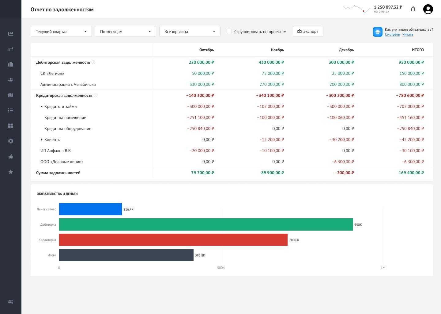 Отчет по задолженностям в Adesk покажет общий размер дебиторки и кредиторки, а также составит список контрагентов: кому должны вы, а кто – вам