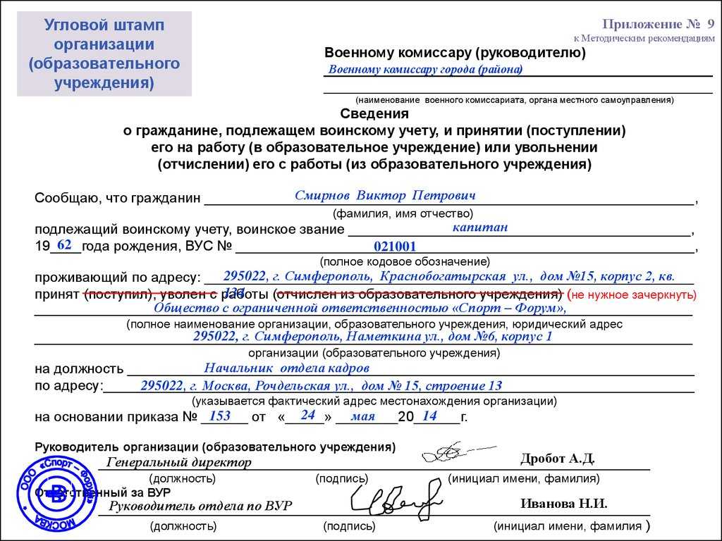 Настоящим уведомлением сообщаю, что гражданин Тихомиров О.В, 1980 года рождения, подлежащий воинскому учету, воинское звание – старший сержант, ВУС № 1234567, проживающий по адресу г. Санкт-Петербург, ул. Ленинградская 5А кв. 123, принят на работу на должность главного инженера в компанию ОАО «Археолог», расположенную по адресу г. Санкт-Петербург, Варшавское шоссе, 2Б, на основании Приказа №555 от 01.03.2019 г.