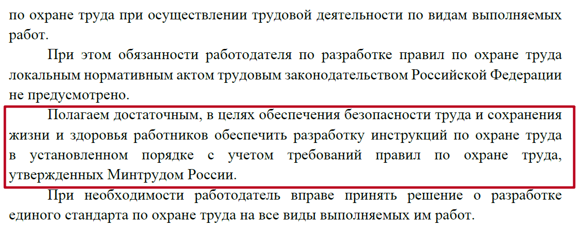 Все дело в том, что правила и инструкции по ОТ разрабатывают работодатели, чтобы обеспечить безопасность труда и сохранения жизни и здоровья работников. Если работодатель исполняет требования ОТ, указанные в правилах, утвержденных федеральным органом исполнительной власти, зачастую этого достаточно.