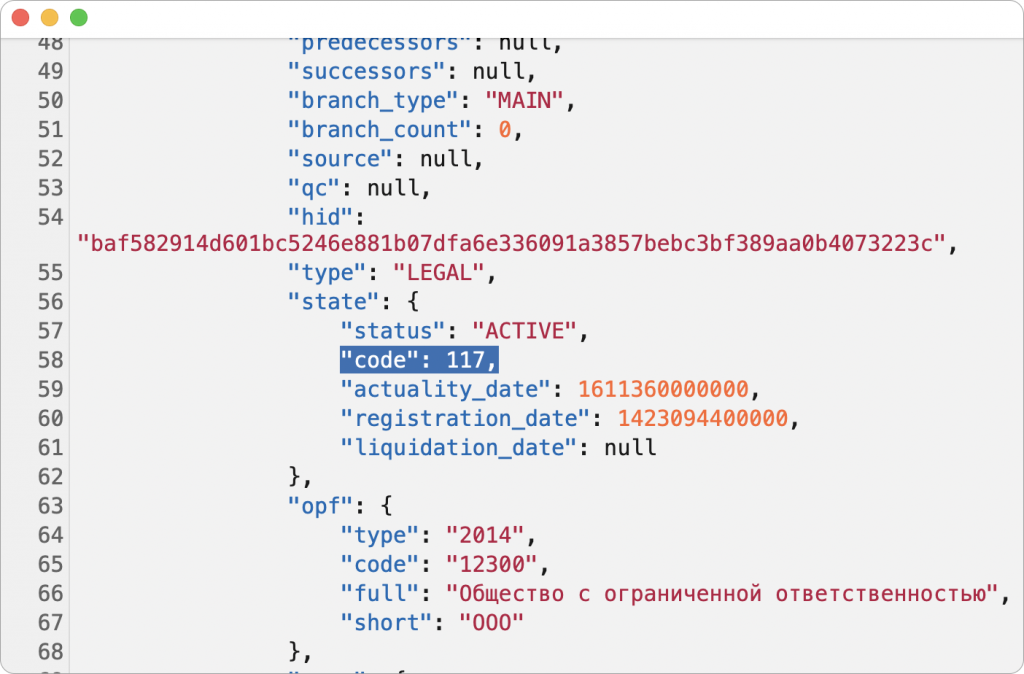 На максимальном тарифе вместе со статусом «Дадата» показывает специальный трехзначный код, например, 113. Для этого служит отдельное поле code.