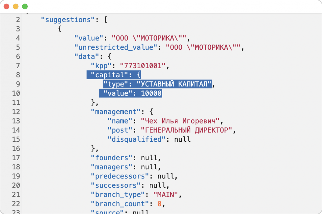 «Дадата» забирает размер уставного капитала из выписки ЕГРЮЛ и показывает в поле data.capital: