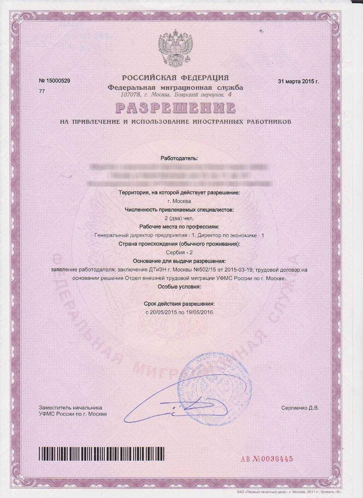 При трудоустройстве визовых сотрудников принимающей стороне потребуется и собственное разрешение на право привлекать таких граждан. Оно выдается в ГУВД МВД после принятия соответствующего заявления. Размер государственной пошлины за такой документ составляет 10 тысяч рублей.
