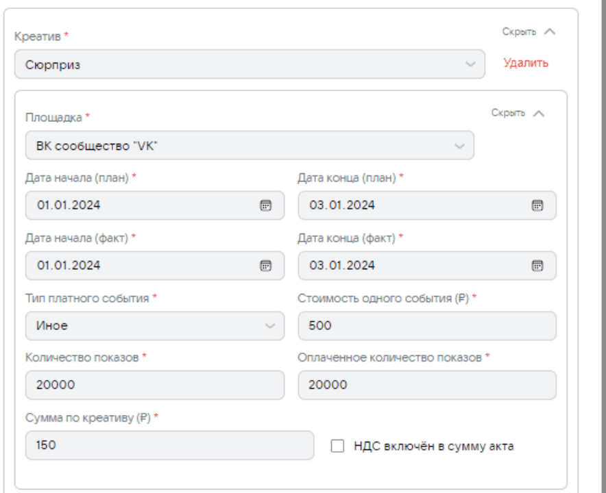 В феврале 2024 VK изменил принцип подачи отчетности по креативам, работающих больше одного месяца. Теперь для каждого из них нужно создавать разбивки по месяцам с информацией о количестве показов и суммах за текущий период.