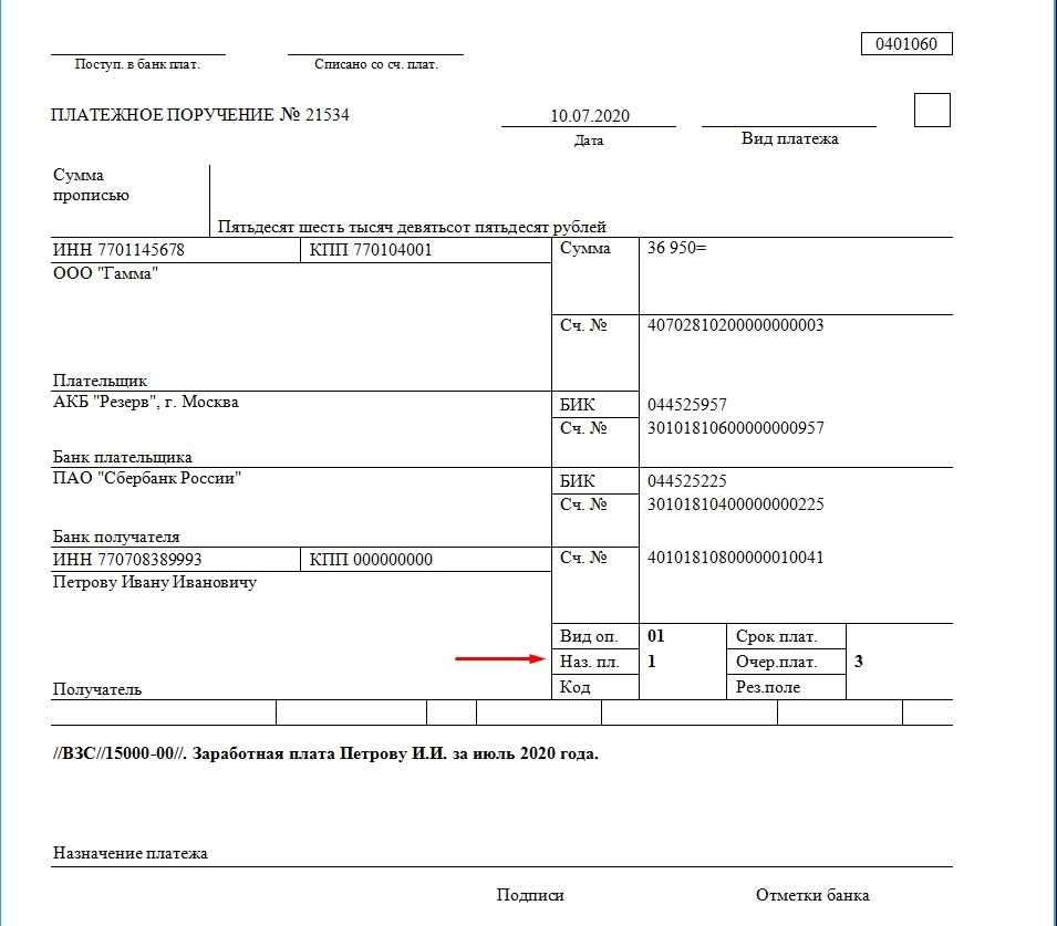 Вот образец платежного поручения на перечисление заработной платы на карту до 01.06.2020: