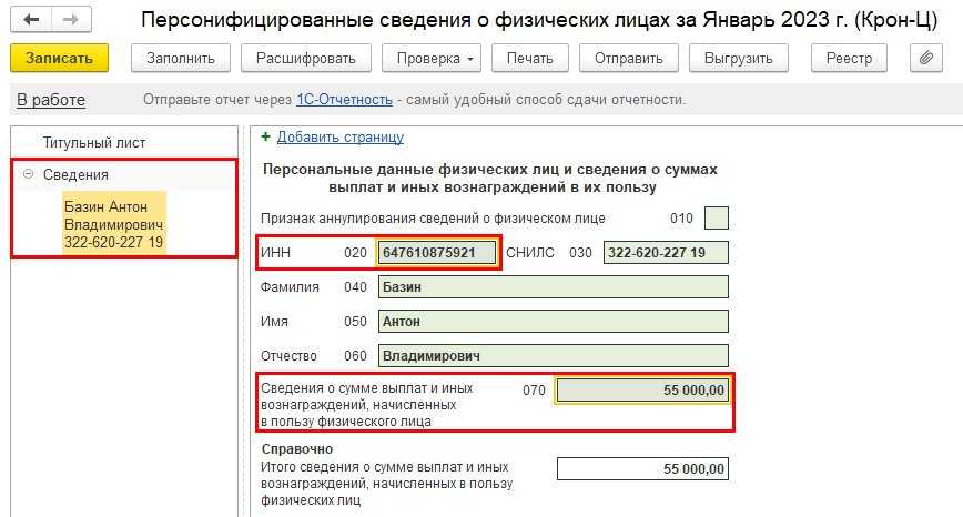Персонифицированные сведения о физических лицах — новая форма отчётности, которую с 2023 г. ежемесячно сдают в ИФНС. В первый раз сведения надо сдать за январь 2023 г. Сведения подавайте на всех работников, числившихся у вас в отчетном месяце по трудовому договору или работавших по ГПД, включая тех, кто в нем уволился, и тех, у кого не было выплат. Исключение — самозанятые, их в отчёт не включайте. На 11 и более человек сведения сдают в электронном виде. В отчёт включают персональные данные каждого физлица и сумму выплат (строка 070), начисленных ему за истекший месяц, как облагаемых, так и не облагаемых взносами. Если в текущем месяце выплат не было, заполните на работника только строки 020 — 060.