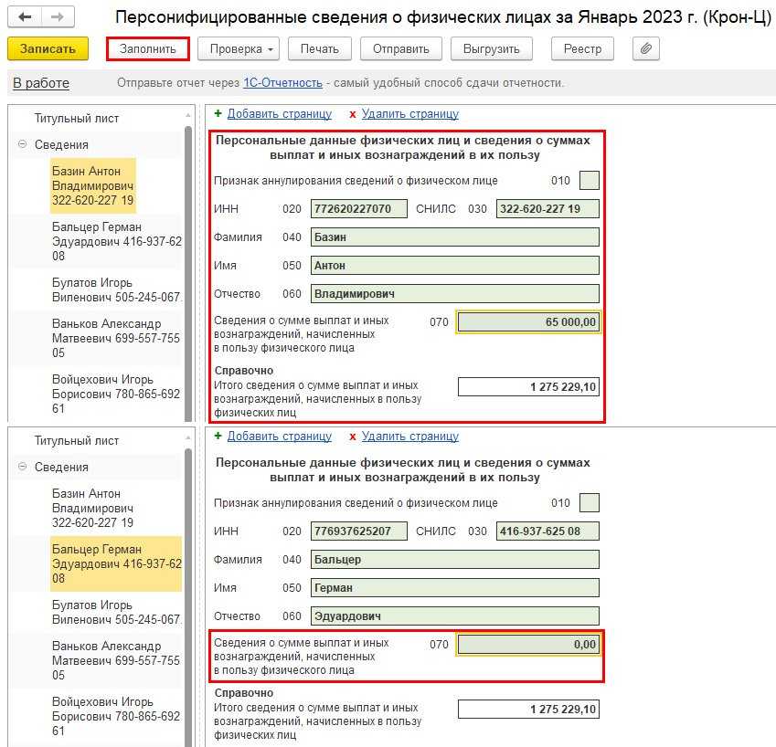 При создании первичного отчета персонифицированных сведений по кнопке Заполнить в форму будут автоматически добавлены страницы сведений по каждому физическому лицу, работающему в организации.
