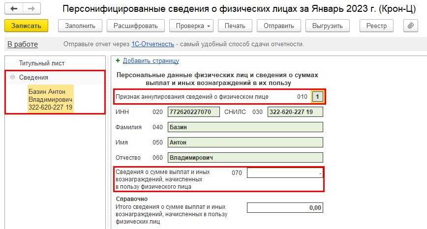 При создании корректирующего отчета персонифицированных сведений по кнопке Заполнить в форме появится только одна страница сведений по сотруднику Базину А.В. В разделе персональных данных автоматически будет установлен признак аннулирования – «1» (строка 010), а также заполнены строки персональных данных, которые необходимо отменить (строки 020-060). В строке 070 – «Сведения о сумме выплат и иных вознаграждений» отобразится прочерк (рис. 5).