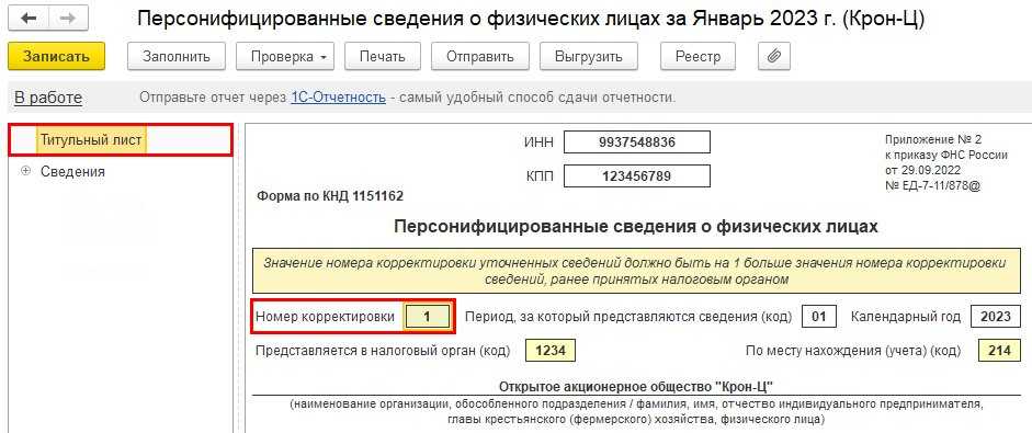 Если после представления первичного отчета в программе «1С:Зарплата и управление персоналом 8» была выявлена и исправлена ошибка в расчете или личных данных сотрудника, работодателю необходимо подать уточненные сведения до представления Расчета по страховым взносам. Для этого нужно создать новый отчет и указать на Титульном листе значение номера корректировки уточненных сведений – «1» (рис. 3).
