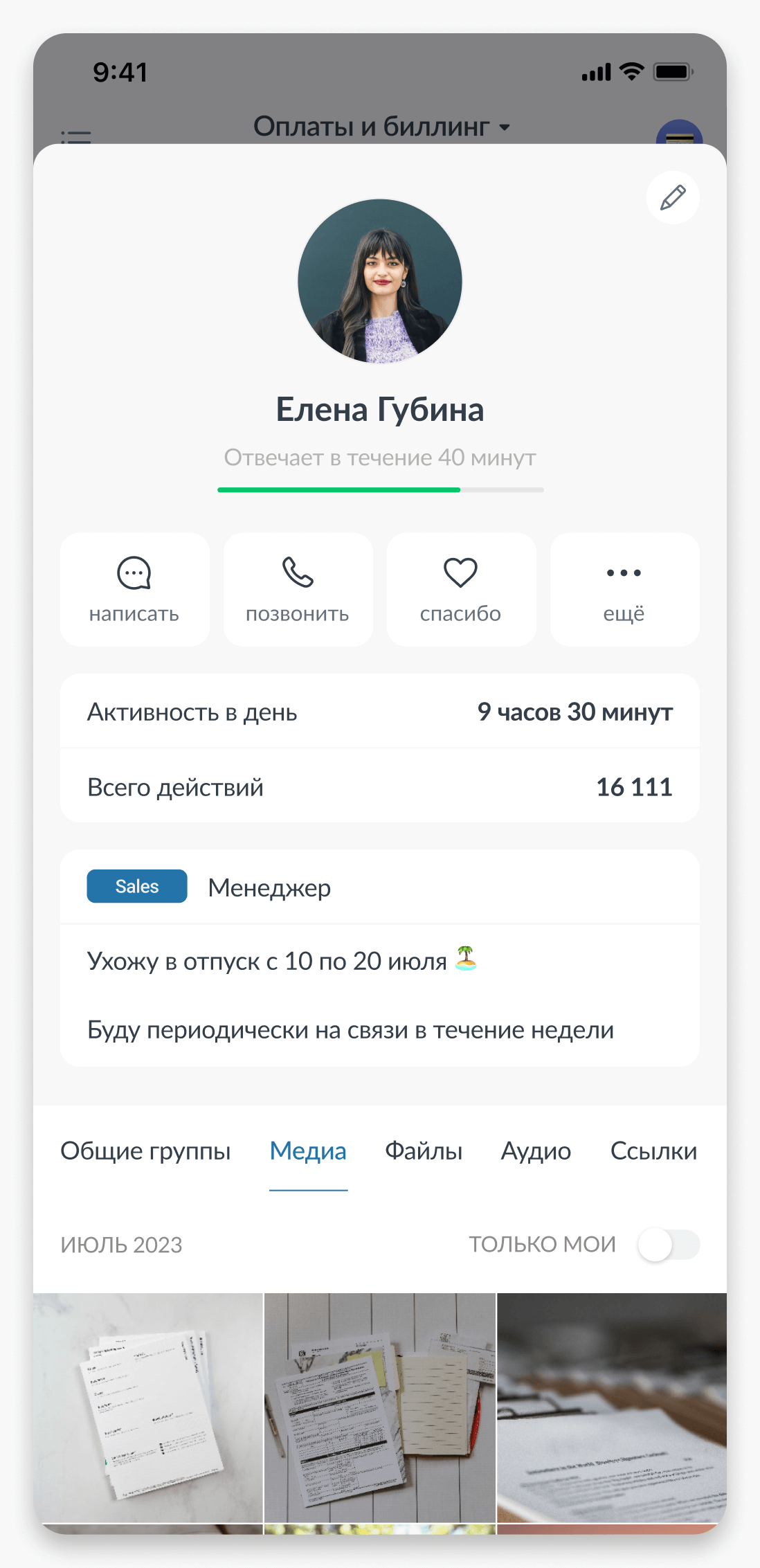 Профиль сотрудника в мессенджере также может содержать полезную информацию о статусе — кто находится в отпуске, к примеру, а кто доступен для общения. Эта функция эффективна на этапе адаптации, когда новый сотрудник может быстро узнать, с кем можно связаться для решения проблем.