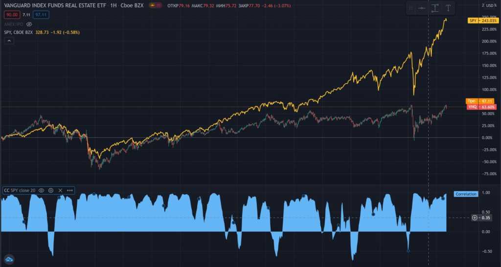 Корреляция близка к единице бОльшую часть времени (сравнение широкого фонда рейтов VNQ с ETF на S&P500)