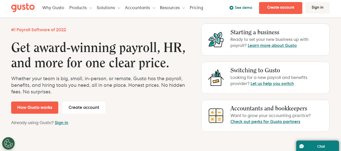 Gusto — это платформа управления персоналом с полным спектром услуг, которая помогает предприятиям с расчетом заработной платы, управлением персоналом и функциями управления персоналом.
