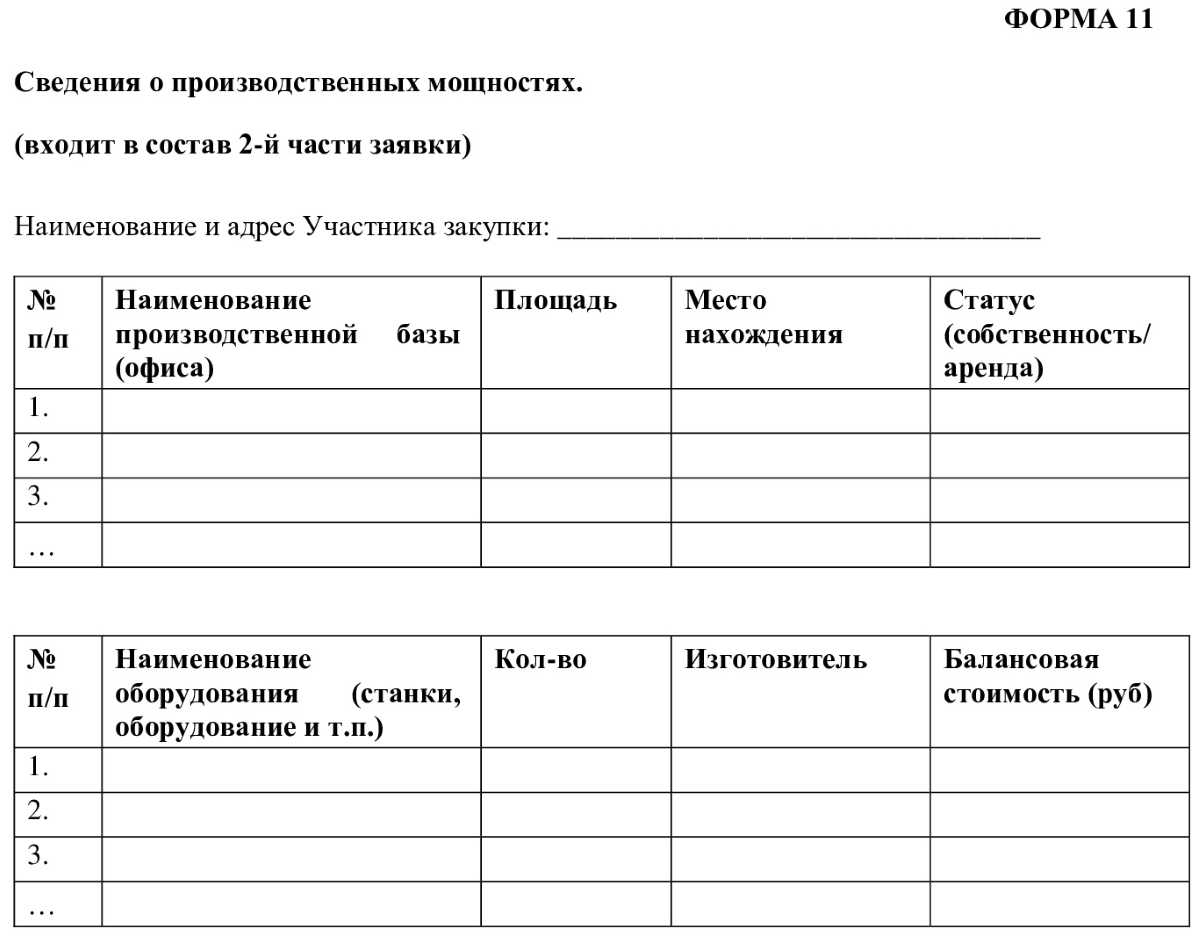 Как правило, сведения о производственных мощностях предоставляют в виде формы, которая содержит: