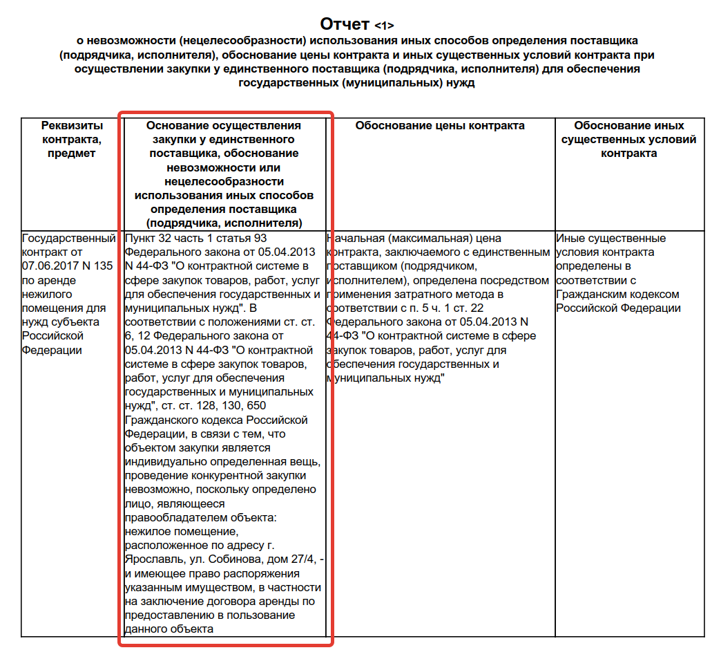 Отчет с обоснованием заключения контракта с единственным поставщиком
