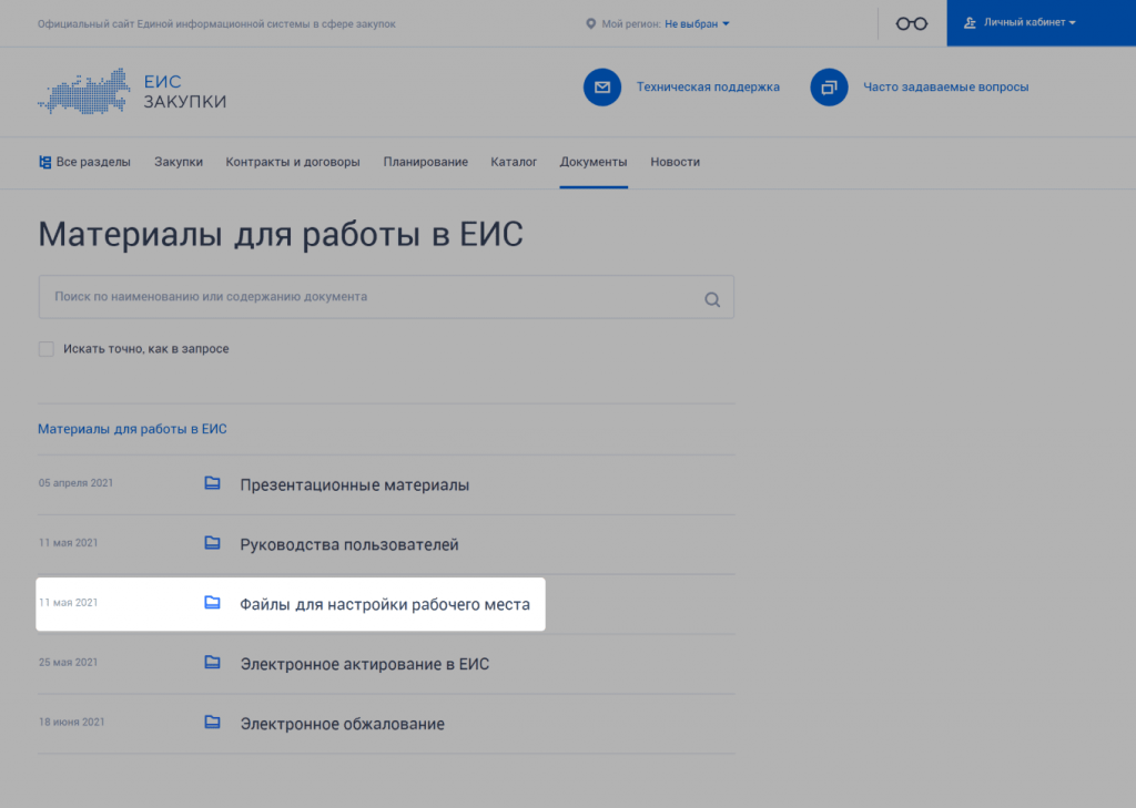 Инструкцию по подготовке рабочего места можно найти в разделе «Документы» → «Материалы для работы в ЕИС» → «Файлы для настройки рабочего места».