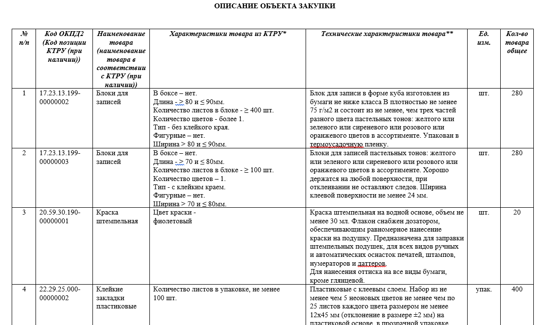 Как поставщика нас интересует, что именно хочет получить заказчик на указанную сумму. Для этого надо скачать файл «Описание объекта закупки». В данном случае требуется достаточно широкий ассортимент канцелярских принадлежностей с чётко указанными характеристиками. Вот только часть позиций.