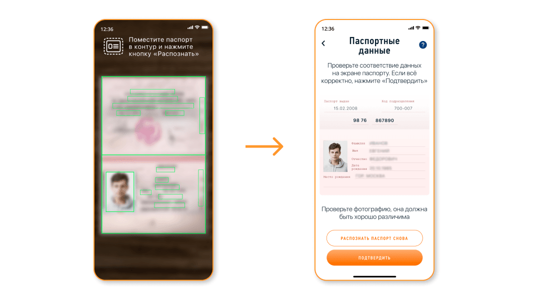 4) Подтвердите паспортные данные. Наведите камеру телефона на паспорт и нажмите «Распознать». Если считанные данные верны, нажмите «Подтвердить» или повторите операцию.