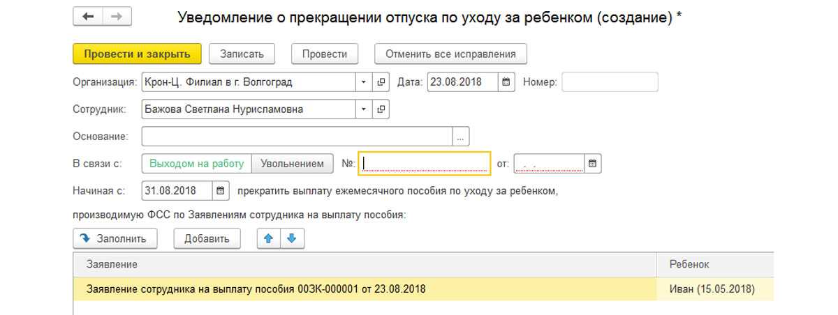 Для примера, если следует изменить данные об отпуске в результате досрочного выхода сотрудника на работу, но при этом сохранить размер пособия.