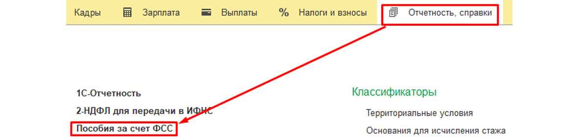 Затем следует нажать на меню и перейти во вкладку «Отчетность, справки-пособия за счет ФСС».