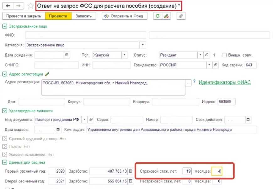 Также «Ответ на запрос ФСС для расчета пособия» можно сформировать на основании документа «Входящий запрос ФСС для расчета пособия»