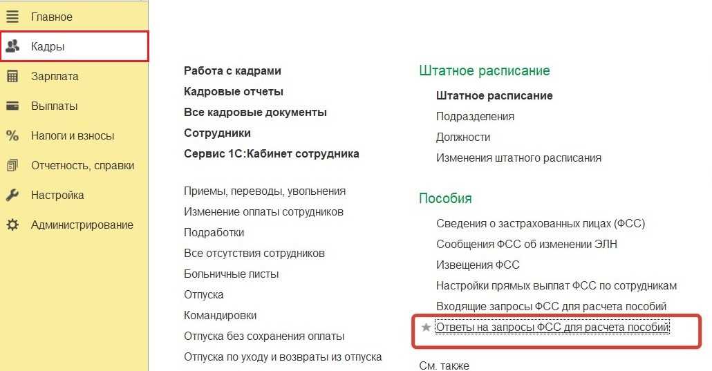 Чтобы отправить ответ Фонду социального страхования в 1С: ЗУП, перейдите в раздел «Кадры», выберите пункт «Ответы на запросы ФСС для расчета пособий».