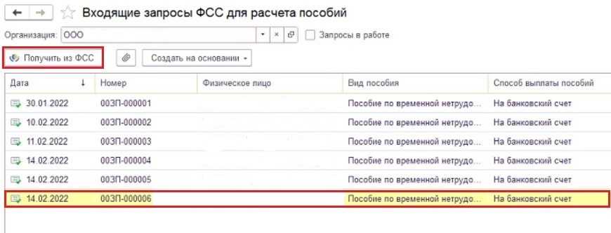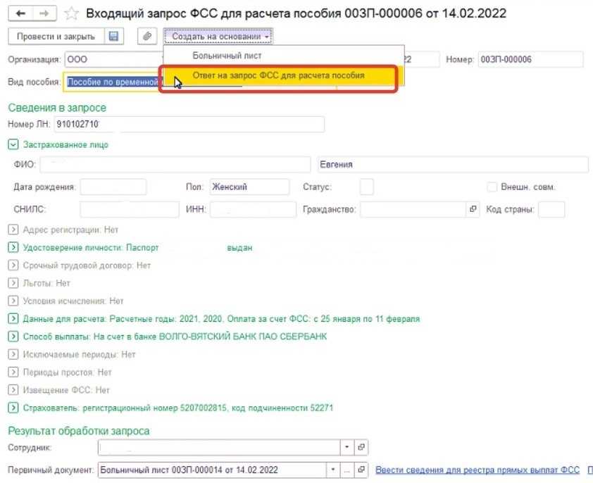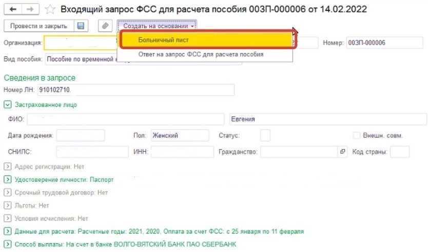 На основании документа «Входящий запрос ФСС для расчета пособия» нужно зарегистрировать документ Больничный лист.