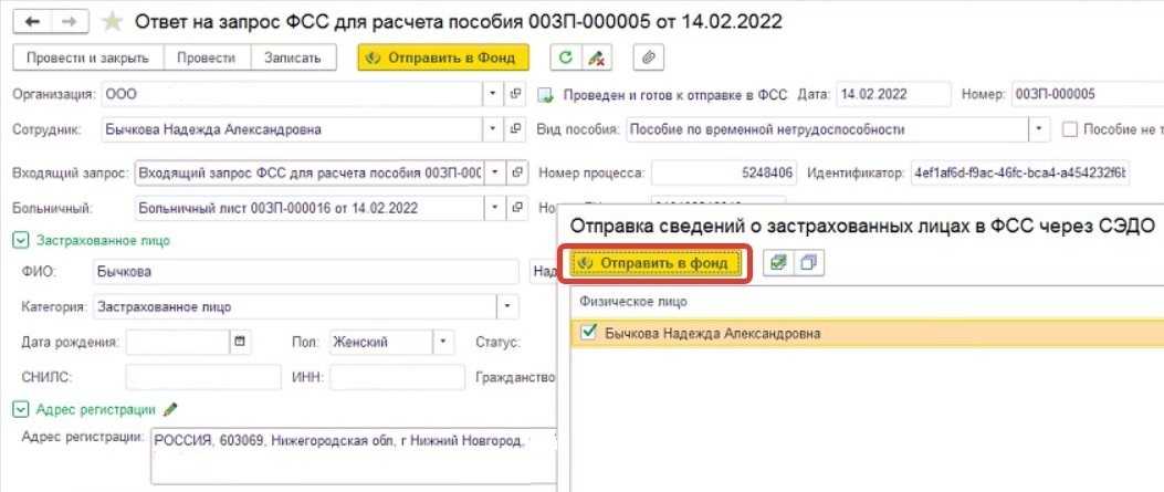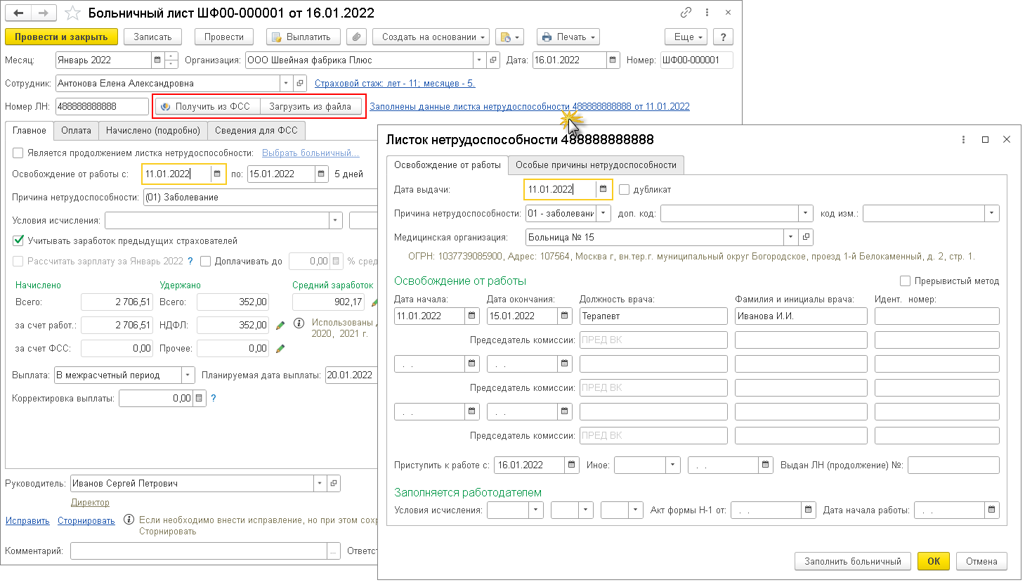 Когда вы создаете больничный лист (раздел «Зарплата», пункт «Все начисления»), нажмите на кнопку «Получить из ФСС».
