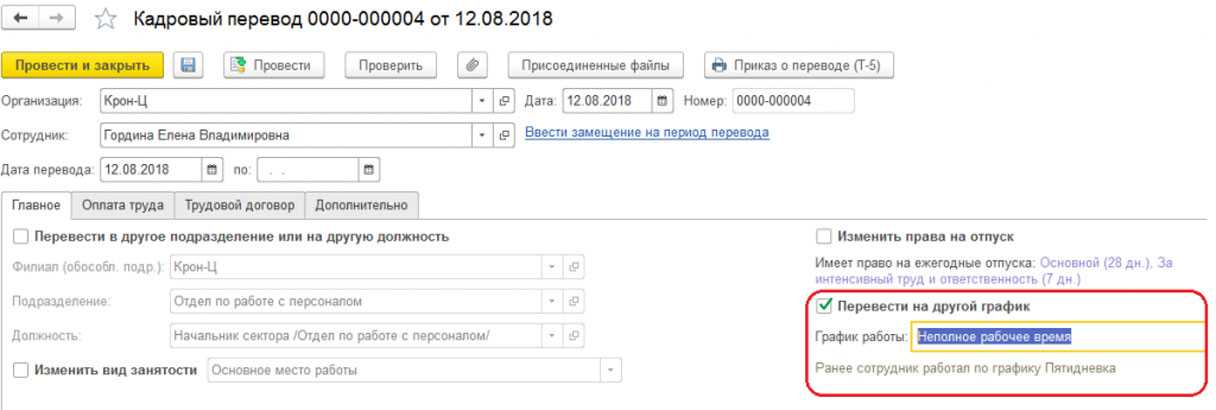 В видеоуроке рассказано, как ввести сведения об изменении графика работы сотрудника