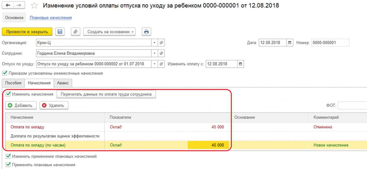 В документе «Возврат из отпуска по уходу за ребенком» можно увидеть остановку начисления всех пособий, которые были внесены первоначально. Этим документом возвращаются основные начисления сотрудника.