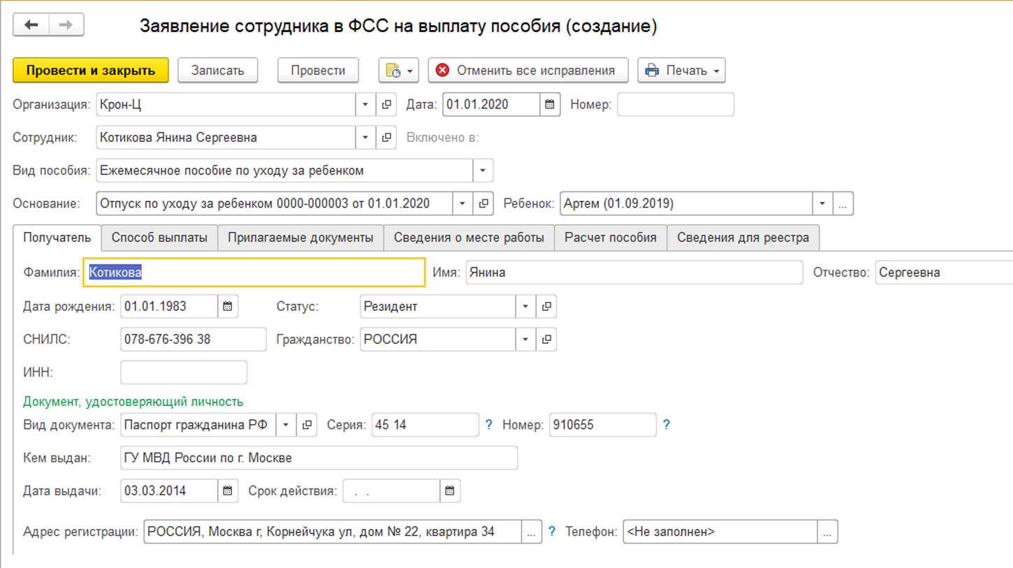Отчетность 4-ФСС, РСВ не показывают информацию о пособии, потому как уплата по страховым взносам не уменьшается на размер их расходов. Данные по «Отпуску» вносятся по основному месту работу и по совместительству. В связи с этим «Сотрудник» отображается как физическое лицо.