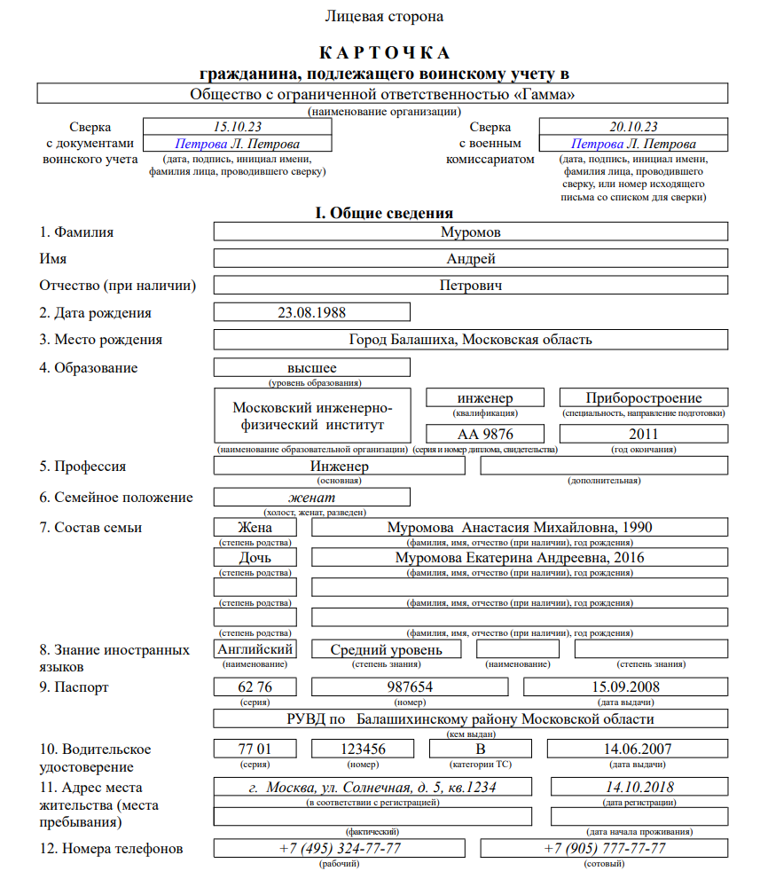 - Сроки заполнения карточек и проведения сверки с фактическими данными. Если в организации произошли изменения воинского учета сотрудников, необходимо вовремя внести соответствующие изменения в карточки и сформировать отчет для военкомата.